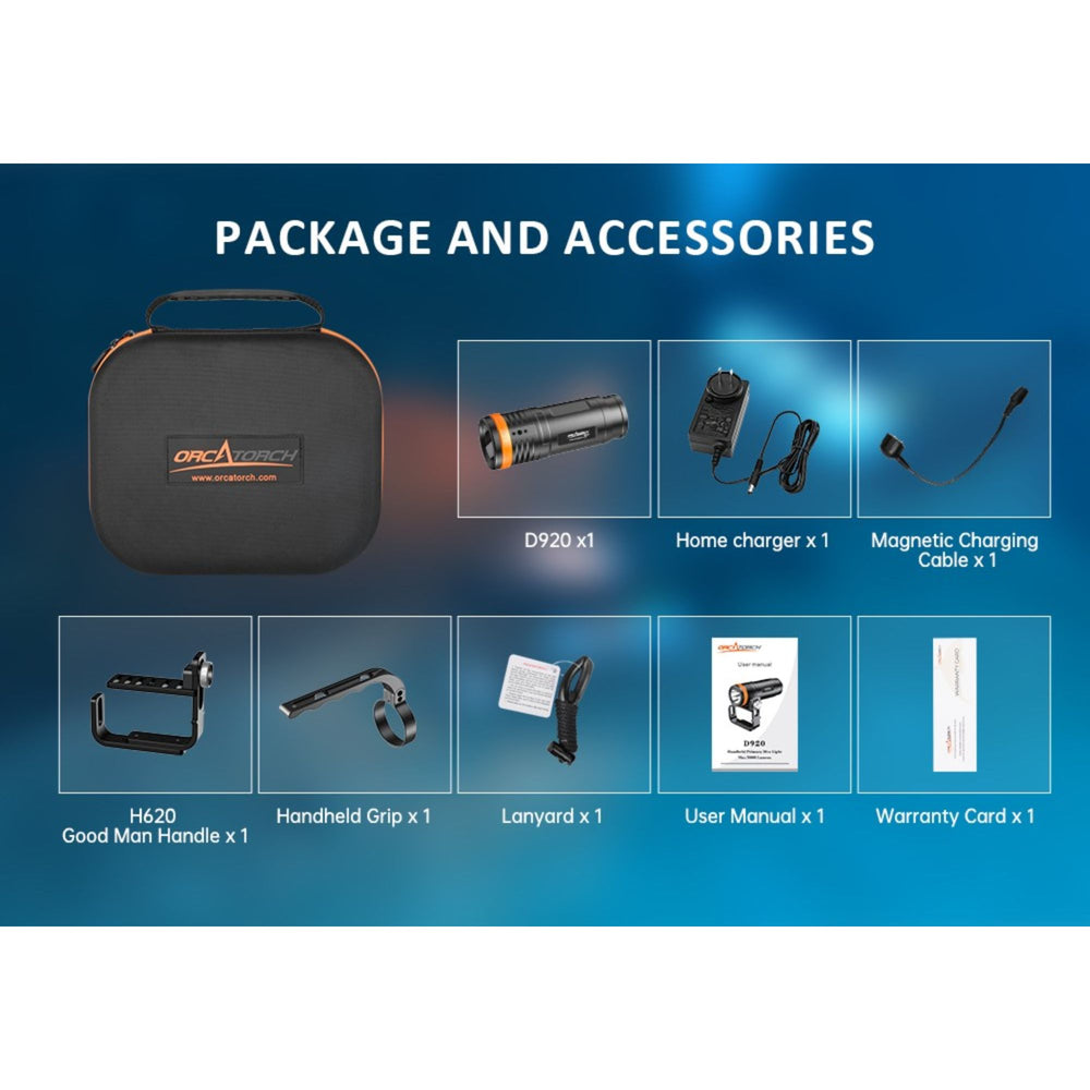 The OrcaTorch D920 Dive Light is a powerful handheld primary torch designed for divers who want serious output in a compact, dependable package. With an impressive 5000-lumen maximum output and a tightly focused 9° beam, it delivers excellent penetration in low visibility, overhead environments, and night dives alike.